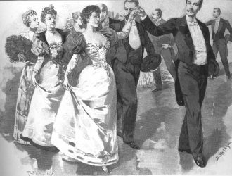 There are also options for the couples to move backward, turn, move sideways or dance in place – these variants are useful when the whole procession, directed by the leading couple, has to criss-cross its own path. The cadences of the music are marked with formal bows, each lasting for two measures of the accompaniment. The dance includes special figures to be danced by individual couples, with shifting hands, turns, etc. The group figures include the parting of the couples, promenades, and passing under the elevated hands of the couple at the front of the line. There are many variations in the way the polonaise may be danced. Throughout, it has to maintain its noble, “upright” image, full of dignity and pride.